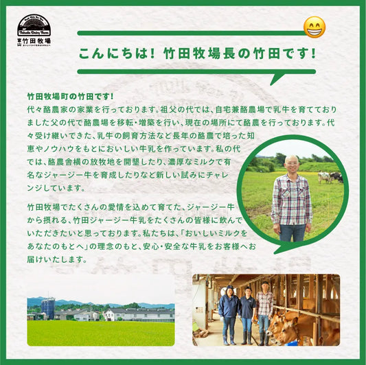 竹田牧場は、標高3,000m級の雄大な立山連峰を望む富山市の南部に位置し、田園に囲まれた月岡地区において、3代半世紀ほど、この地で続く酪農場です。立山連峰からのゆたかで清らかな雪解け水で育つ、ジャージー種60頭・ホルスタイン種60頭を飼育するファミリーファームです。
